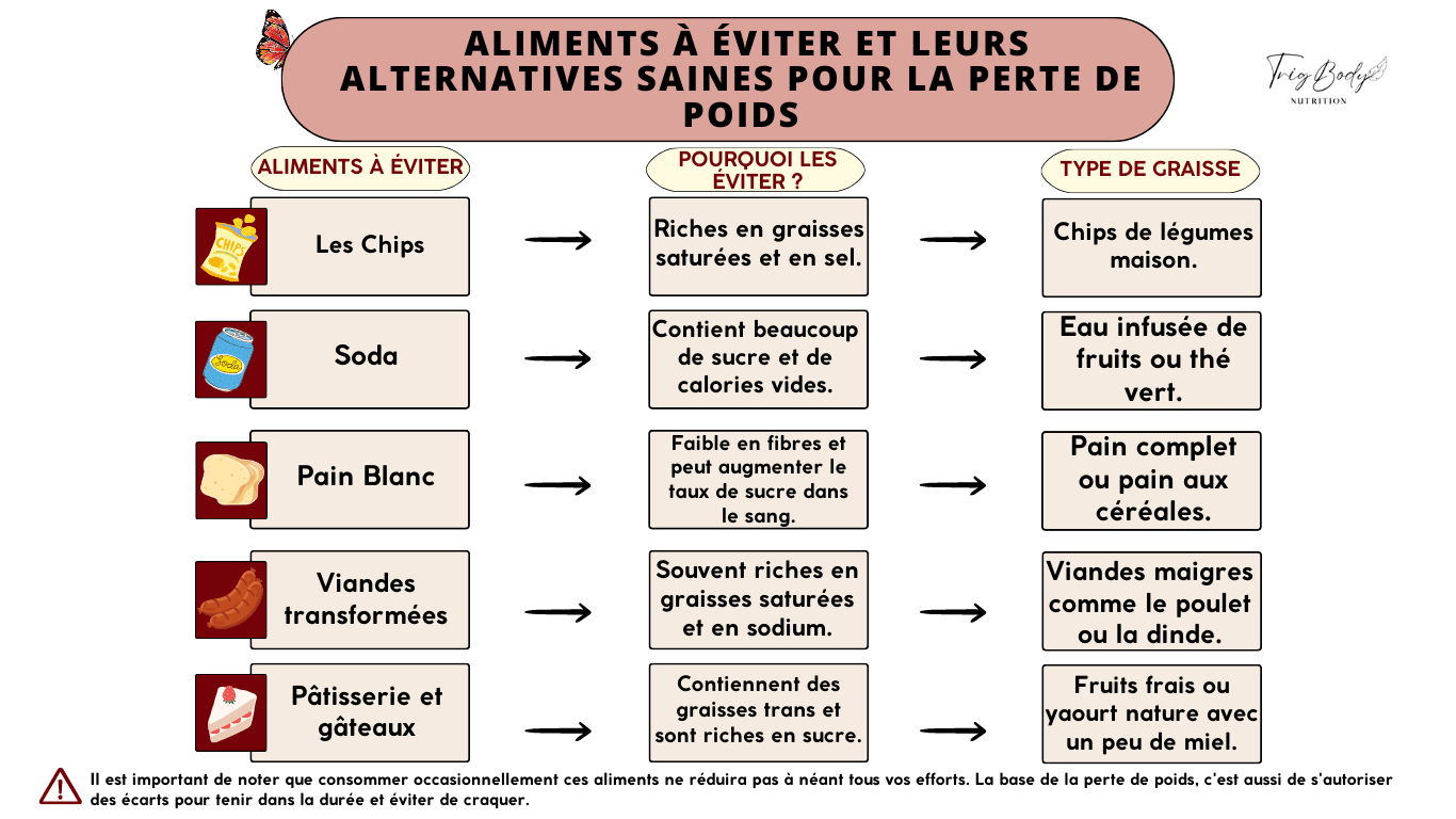 Il est également important de noter que tous les aliments ne sont pas égaux lorsqu'il s'agit de perte de poids. Certains aliments peuvent sembler sains, mais ils peuvent en fait être riches en calories et en sucre. Voici un tableau montrant quelques aliments à éviter et leurs alternatives plus saines :